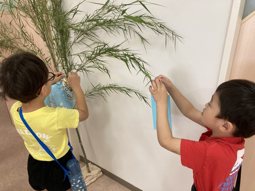 みんなで、短冊に願い事を書き、笹の葉に飾りました