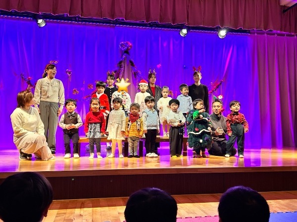 チャイルドスクール、たいよう組(年長)のお友達の、ハンドベルの発表でクリスマスパーティーがスタートしました